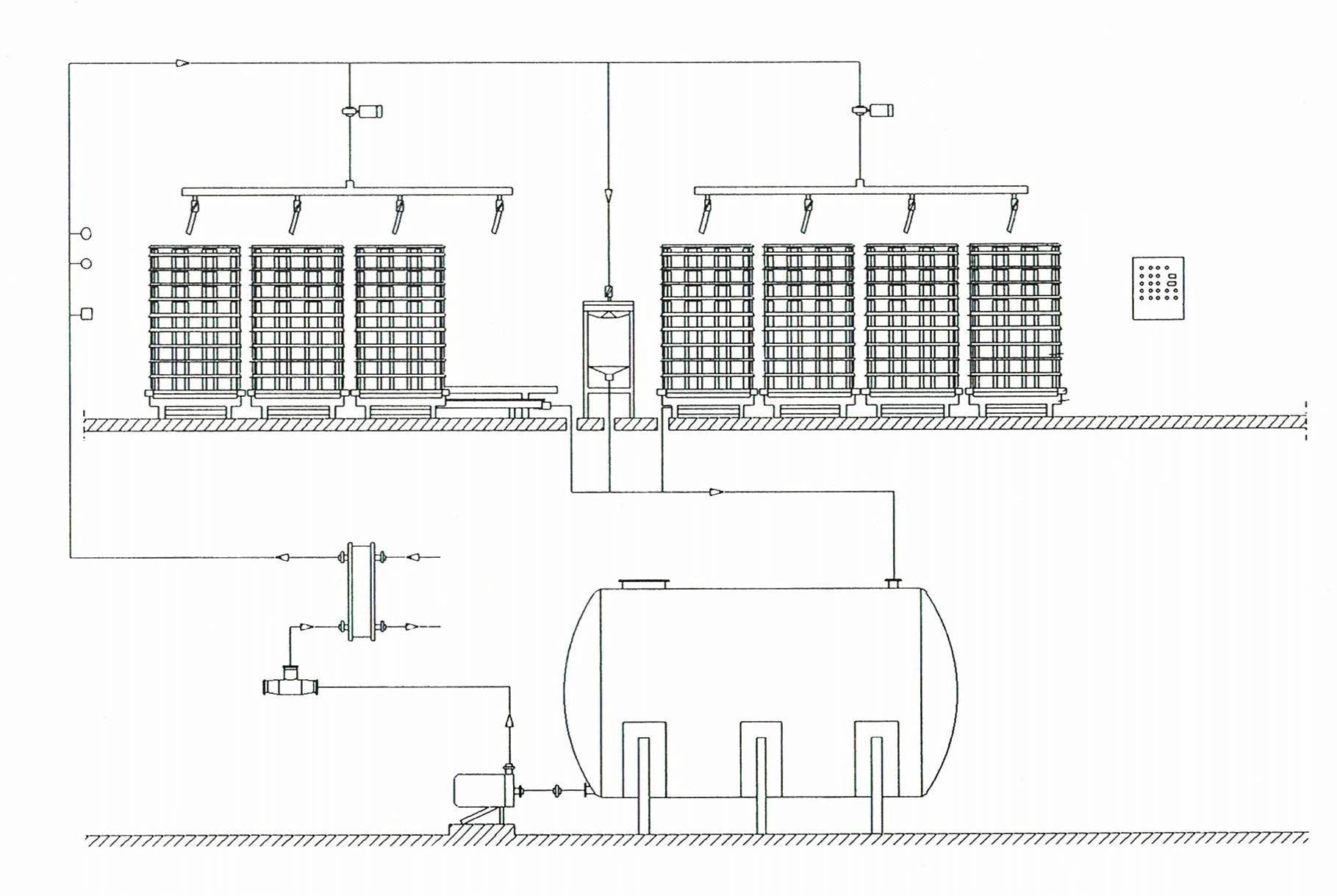 The brining trays are made of food/approved green APS plastic. They are designed for stacking with max. 8 trays high. The brining is done by circulation of brine – as shown on the below sketch. App 20 ltr/min are led into the tray. Half of this flows into the tray below, through the holes in the bottom. The other half flows through the splits in the sides of the trays and into the tray below. In the same way the brine flows from tray to tray, and finally from the bottom tray into the gutters.