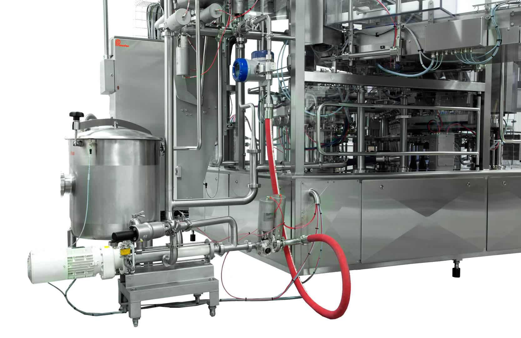 It is also possible to add INLINE FRUIT MIXING equipment to the machines for mixing in jam or flavor just before the fillers in the filling machine. By adding this equipment, it becomes possible to make fast changeovers between various flavors/jams with very little product waste. It also eliminates the necessity for mixing tanks prior to the filling machine.
