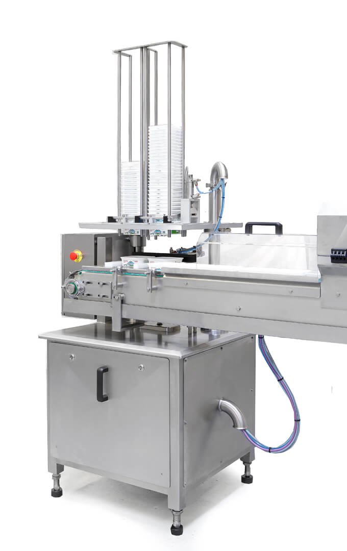 Membrane dispenser, where a sterilized membrane is placed on top of the coagulated cheese. Dry salting unit, dosing an adjustable quantity of fine salt on the foil. Lid dispenser, dispensing a sterilized plastic-foil on the cup and point welding it in order to keep it in position during the move to the heat sealing station. Heat sealing, for complete sealing of the lid-material. Date coder, for ink coding on top of the lid-material. Cover lid dispenser (optional) for applying a snap-on lid on top of the plastic-foil lid. Lift and transfer station, moving the cups to the discharge conveyor. Discharge conveyor transporting the cups to the packing area.